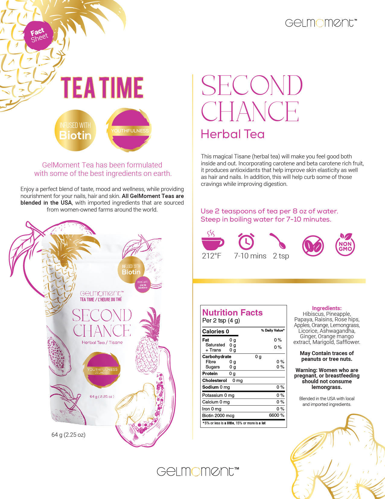 Hibiscus, pineapple, papaya, raisins, rose hips, apples, orange, lemongrass, licorice, ashwagandha, ginger, orange mango extract, marigold, safflower.